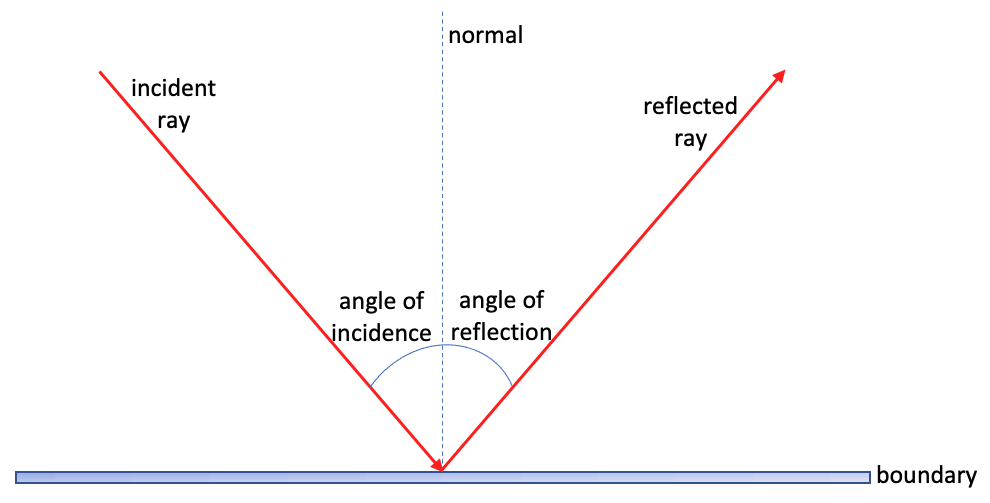 Reflection happens when light encounters a boundary between two media. In this case, at least a part of the light will be turned back to the same medium in which it was traveling before. In the following figure, Reflection happens when light encounters a boundary between two media. In this case, at least a part of the light will be turned back to the same medium in which it was traveling before. In the following figure, the ray representing the light ray before it encounters the boundary is called the “incident ray” and the light after it encounters the boundary and is reflected is called the “reflected ray”. Each of these rays forms an identical angle with respect to a line perpendicular to the boundary, called the “normal”. These angles, namely the “angle of incidence” and the “angle of reflection”, respectively, are equal to each other.