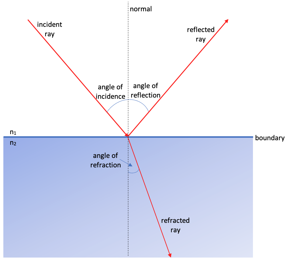 When light encounters a boundary, not all of it gets reflected, however. A part of it passes through the material. How much passes through depends on the material’s transparency. But, even when light passes from one transparent medium into another, it usually bends. This bending is due to the different refractive index (n) of the two materials. When light hits the boundary between two materials, it bends towards the material with the higher refractive index. That means that if light passes from a material with a lower refractive index into a material with a higher refractive index, it will get closer to the normal, while if it passes from a material with a higher refractive index into one with a lower refractive index, it will get farther away from the normal.