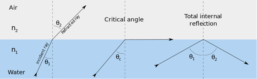 Remember reflection? There is one more amazing thing about it that we exploit in everyday life. It’s called “total internal reflection” and it happens only when light is passing from a denser medium (with a higher refractive index) into a less dense medium. At incident angles (θ1) smaller than the “critical angle” (θc), light cannot be refracted anymore. When this happens, all the light is reflected back into the denser medium. If the denser medium is surrounded by a less dense medium, the light gets trapped inside. In the experiments that you will see here, we will trap light in water and in optical fibers.