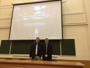 As part of the Science Festival in Moscow 6-8 of October 2017, a delegation from UiT and NTNU visited Moscow and participated with talks and opening of the polar night exhibition. All posters had been translated into Russian, and the exhibition was part of the official programme for the 2017 Science Festival in Moscow. Geir Johnsen, Malin Daase and Jørgen Berge also participated with scientific talks during a Norwegian-Russian seminar at the Lomonosov Moscow Starte University, as well as during the main festival. Kenneth Ruud (vice-rector at UiT) opened the festival and exhibition. The polar night exhibition has now been produced in three languages, and have been shown in Norway, Canada, USA and Russia.
