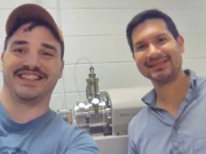 Brandon Hassett and Eli Borrego posing in front of the Kolomiet’s lab’s GCMS.