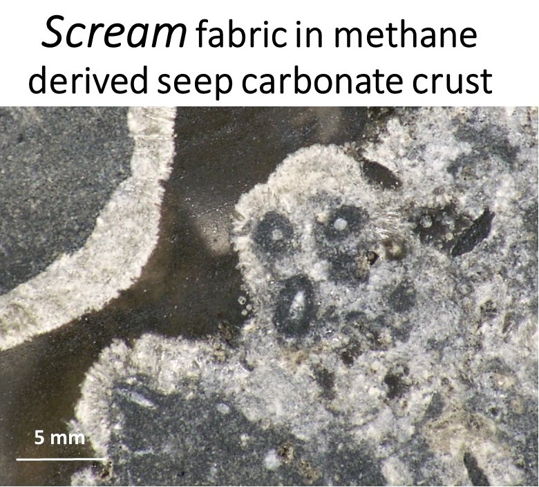 Methane-derived carbonate crusts that form at cold seeps are unique archives of past methane emissions. Seepage histories are recorded in the carbonate minerals that sometimes form unexpected visuals such as in the Scream fabric seen here.