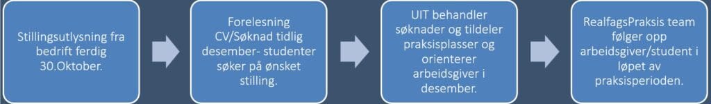 RealfagsPraksis går på vårsemesteret, og forberedelsene fra våre praksispartnere skjer på høsten. Vi samler inn stillingsutlysninger med innleveringsfrist ved utgangen av oktober. Studentene har påmeldingsfrist for emnet 1.desember, og søker på ønsket praksisstilling. UiT behandler søknader samt tildeler praksisstillinger, og praksispartner orienteres om hvilke studenter de får tildelt i desember.